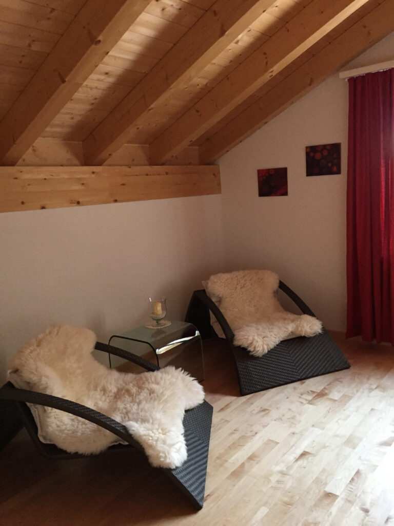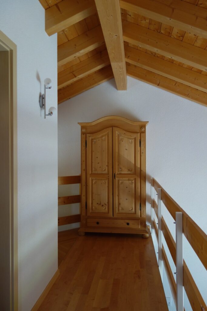 Im gemütlichen Schlafzimmer unter den charmanten Dachbalken erwartet Sie ein komfortables Doppelbett, das erholsame Nächte verspricht. Zusätzlich stehen Ihnen eine praktische Kommode, ein geräumiger Kleiderschrank sowie ein einladender Loungebereich zum Entspannen zur Verfügung.