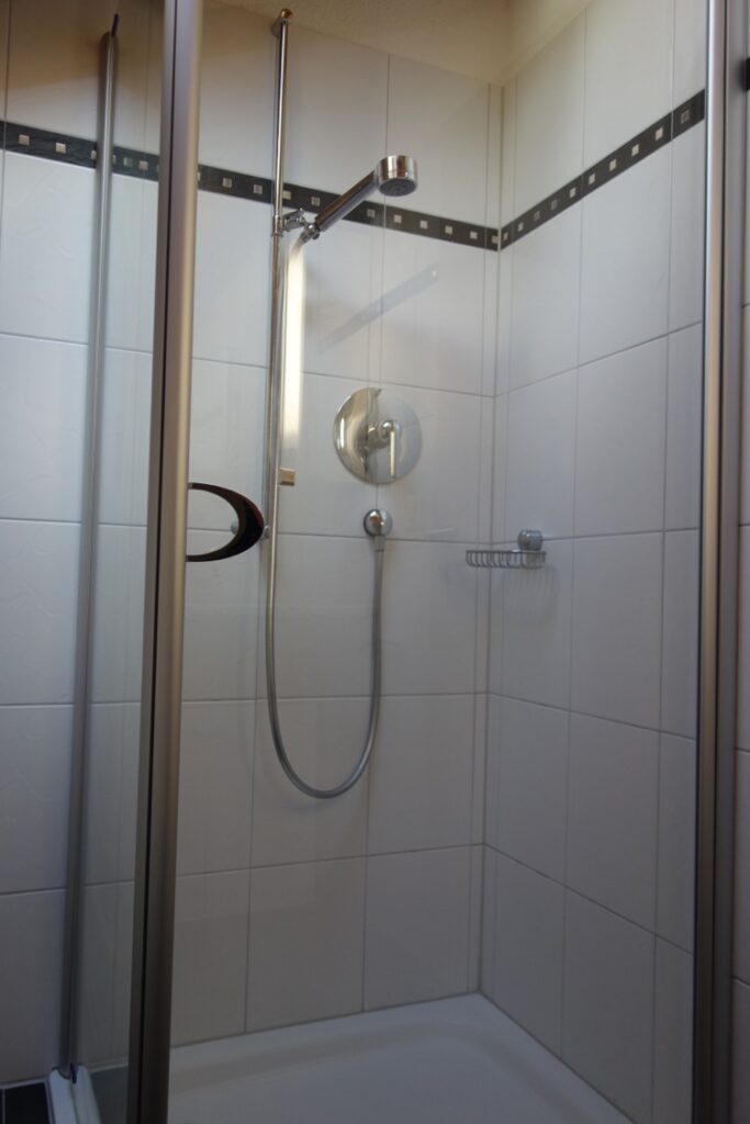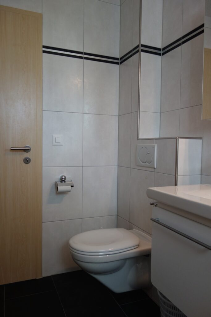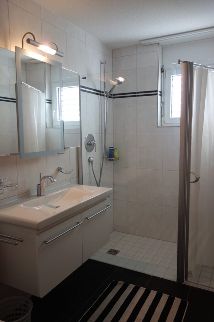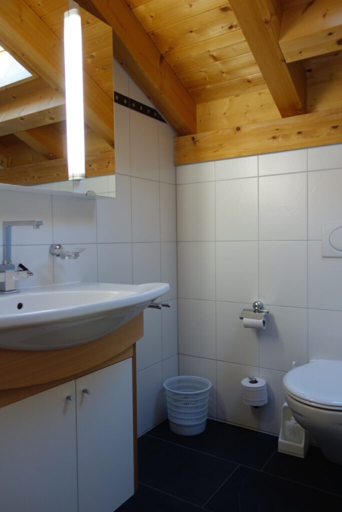 Sowohl das Badezimmer im Ober- als auch im Untergeschoss verfügen über je eine gläserne Duschkabine, ein WC und ein grosses Waschbecken. Hand- und Duschtücher sind ebenfalls für bis zu 6 Gäste vorhanden.
